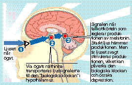 Så slipper du bli deppig av mörkret Känns allt som ett kompakt mörker? Du är i gott sällskap i dunklet. Över en miljon svenskar blir nedstämda under den mörka årstiden. Men det går att mota höstdeppen. När dagarna blir mörkare kommer tröttheten som ett brev på posten. 1,2 miljoner svenskar blir nedstämda. En kvarts miljon drabbas av årstidsbunden depression. Ofta sätter depressionen in i september och lättar framemot maj, då ljuset återvänder. Och just ljuset är en viktig faktor när det gäller SAD, Seasonal Affective Disorder, årstidsbunden depression. För mycket melatonin Vi har ännu inte hela svaret på vad som orsakar SAD. Men det verkar som antalet drabbade är störst där antalet soltimmar är minst, säger Björn-Erik Thalén, överläkare på S:t Görans sjukhus i Stockholm. Man vet att ljus påverkar vår biologiska klocka och våra hormoner. När det är ljust stängs produktionen av sömnhormonet melatonin av. Samtidigt ökar halterna av stresshormonet kortisol. Den som lider av SAD har en rubbning av den biologiska klockan. Eftersom man inte får tillräckligt med ljus produceras det melatonin även när vi är vakna. Kortisolet, som aktiverar oss, kommer inte igång som det ska. Mediciner hjälper Det finns också en koppling till signalsubstansen serotonin. Ljus verkar öka serotoninet. Sedan länge vet man att brist på serotonin kan orsaka depression. Det är också därför antidepressiva mediciner hjälper mot SAD. De påverkar serotoninet i hjärnan. Numera kombinerar man ibland medicin och ljusterapi för att få bäst resultat. Mellan 60 och 70 procent blir hjälpta av ljusterapi, säger Björn-Erik Thalén. Terapin ges i ett särskilt rum med vita väggar och vita möbler. Patienten får svepa in sig i ett vitt lakan så att ljuset från de speciella lysrören inte ska absorberas av mörka ytor. Patienten får i sig ljuset indirekt, vilket är viktigt. Biologiska reaktioner Det är tveksamt om lampor för hemmabruk har den effekten. Dels kan ljuset hinna absorberas av mörka ytor innan det når ögat, dels kan det vara farligt för ögat med starkt, direkt ljus. SAD handlar om rent biologiska reaktioner. Det kan alltså inte botas med psykoterapi. Men det finns en del man kan tänka på själv om man lätt blir trött på hösten: Sök ljus! Promenera till jobbet, gå ut på lunchen och på helgerna. Även om det är mulet får du i dig nyttigt ljus. Lider du av SAD? Ofta kommer symptomen i septemberoktober och lättar i maj. Men vissa kan drabbas redan i augusti, andra i februari. För att få diagnosen SAD måste depressionen komma samma tid minst två år i rad. Om du misstänker att du drabbats av årstidsbunden depression bör du kontakta läkare för att få en diagnos. Kvinnor utsatta De flesta drabbade är kvinnor. Hormoner styr Hormonproduktionen varierar under dygnet. På natten produceras sömnhormonet melatonin. På dagen har vi mer av stresshormonet kortisol i kroppen. Om kroppen inte får tillräckligt mycket ljus produceras melatonin även under dagen och kortisolet kommer inte igång som det ska. När hormonerna kommer i obalans kan man bli deprimerad. En annan teori är att ljus ökar produktionen av signalsubstansen serotonin. Brist på serotonin är en av orsakerna till depression.